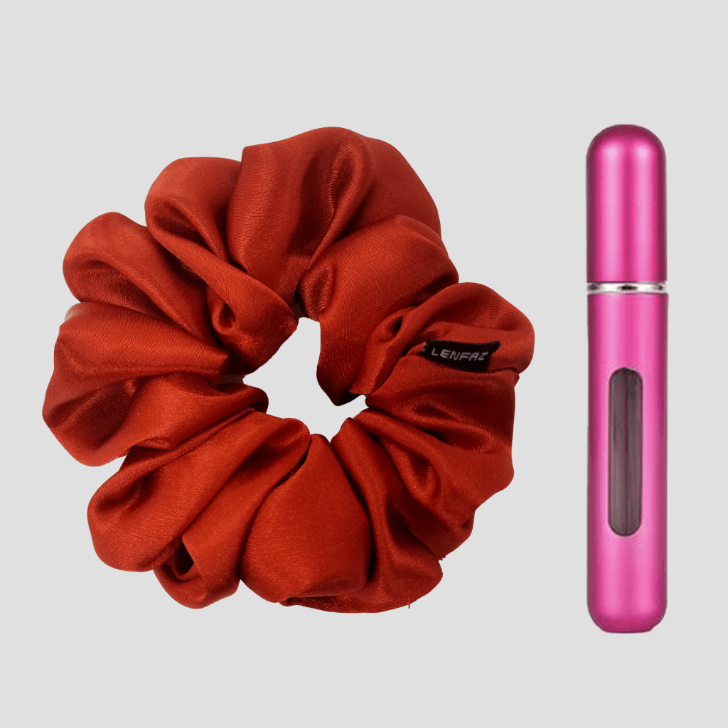 Crimson Red Satin Silk Scrunchie - Berry Pink Mini Perfume Spray Btl.