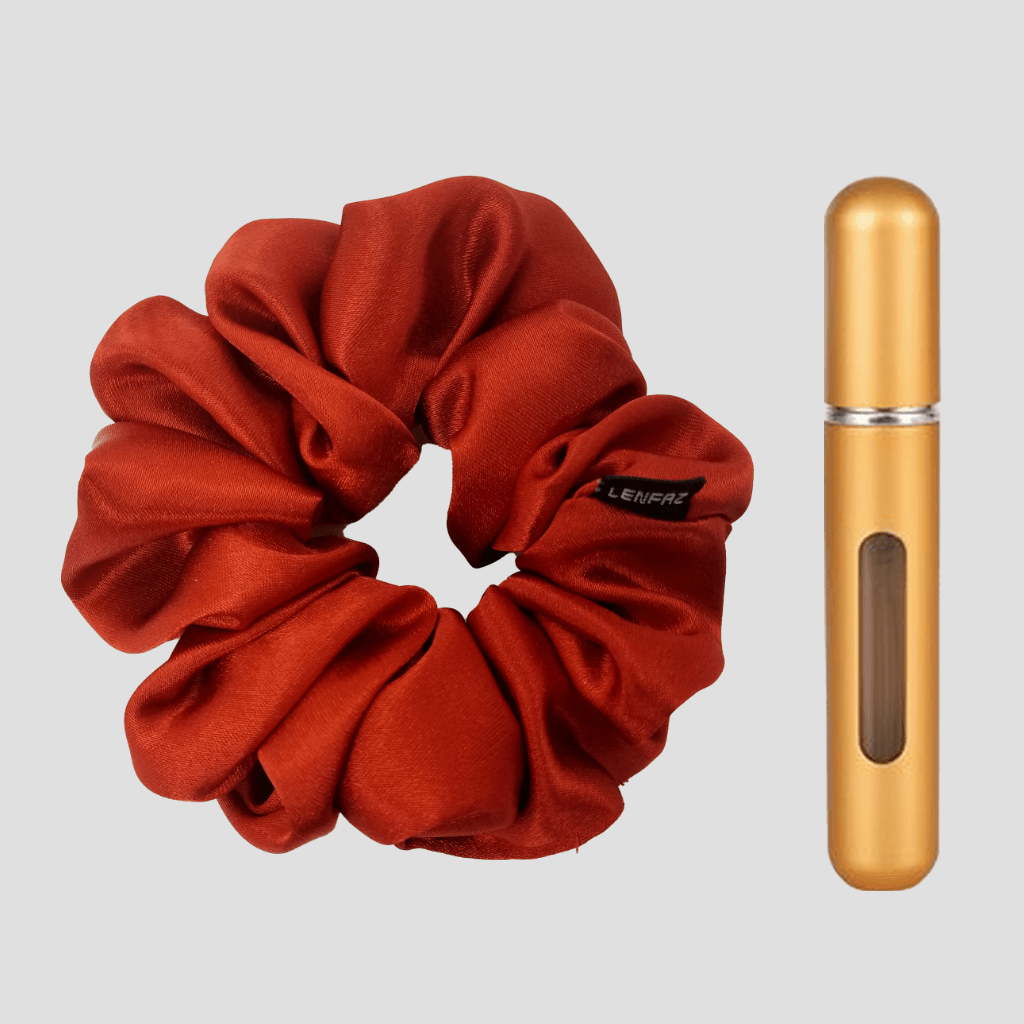 Crimson Red Satin Silk Scrunchie - Champagne Gold Mini Perfume Spray Btl.