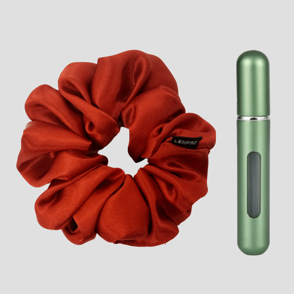 Crimson Red Satin Silk Scrunchie - Sage Green Mini Perfume Spray Btl.