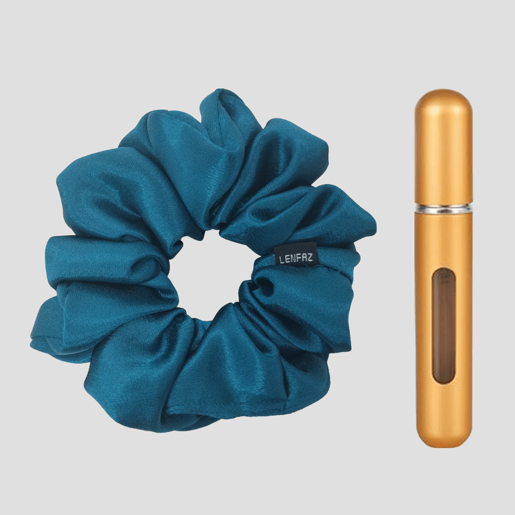 Deep Turquoise Satin Silk Scrunchie - Champagne Gold Mini Perfume Spray Btl.