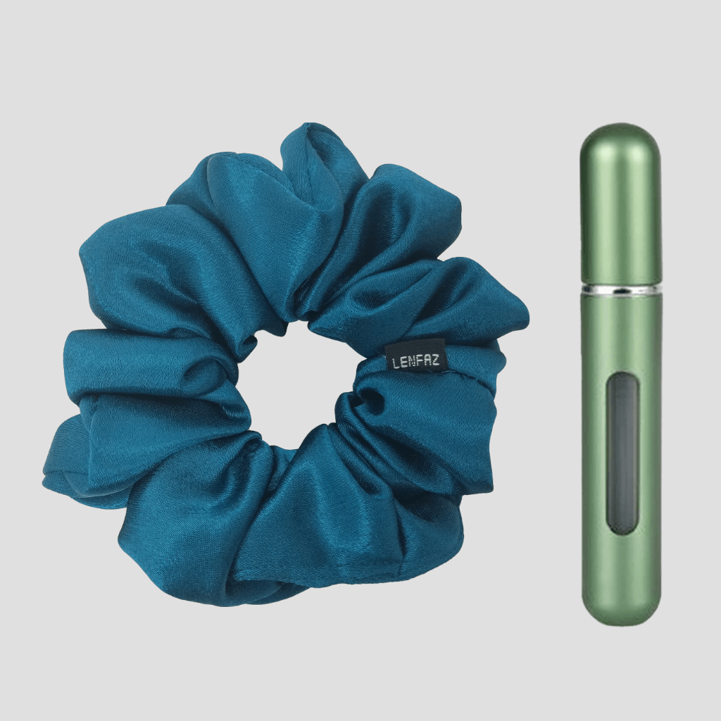 Deep Turquoise Satin Silk Scrunchie - Sage Green Mini Perfume Spray Btl.