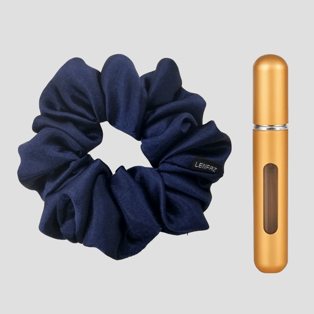 Midnight Blue Satin Silk Scrunchie - Champagne Gold Mini Perfume Spray Btl.