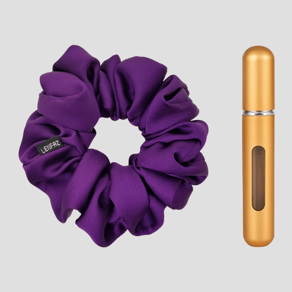 Plum Purple Matte Silk Scrunchie - Champagne Gold Mini Perfume Spray Btl.