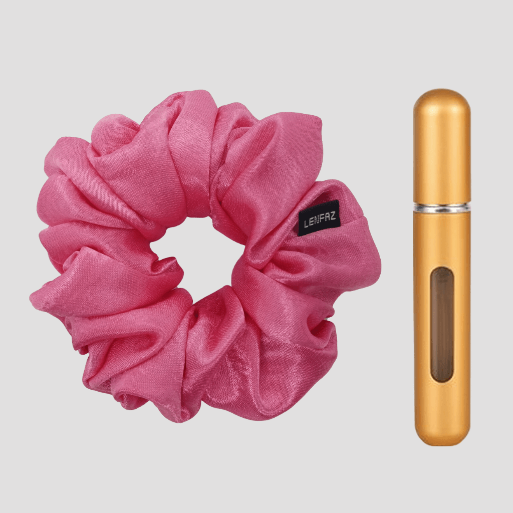 Pretty Pink Satin Silk Scrunchie - Champagne Gold Mini Perfume Spray Btl.