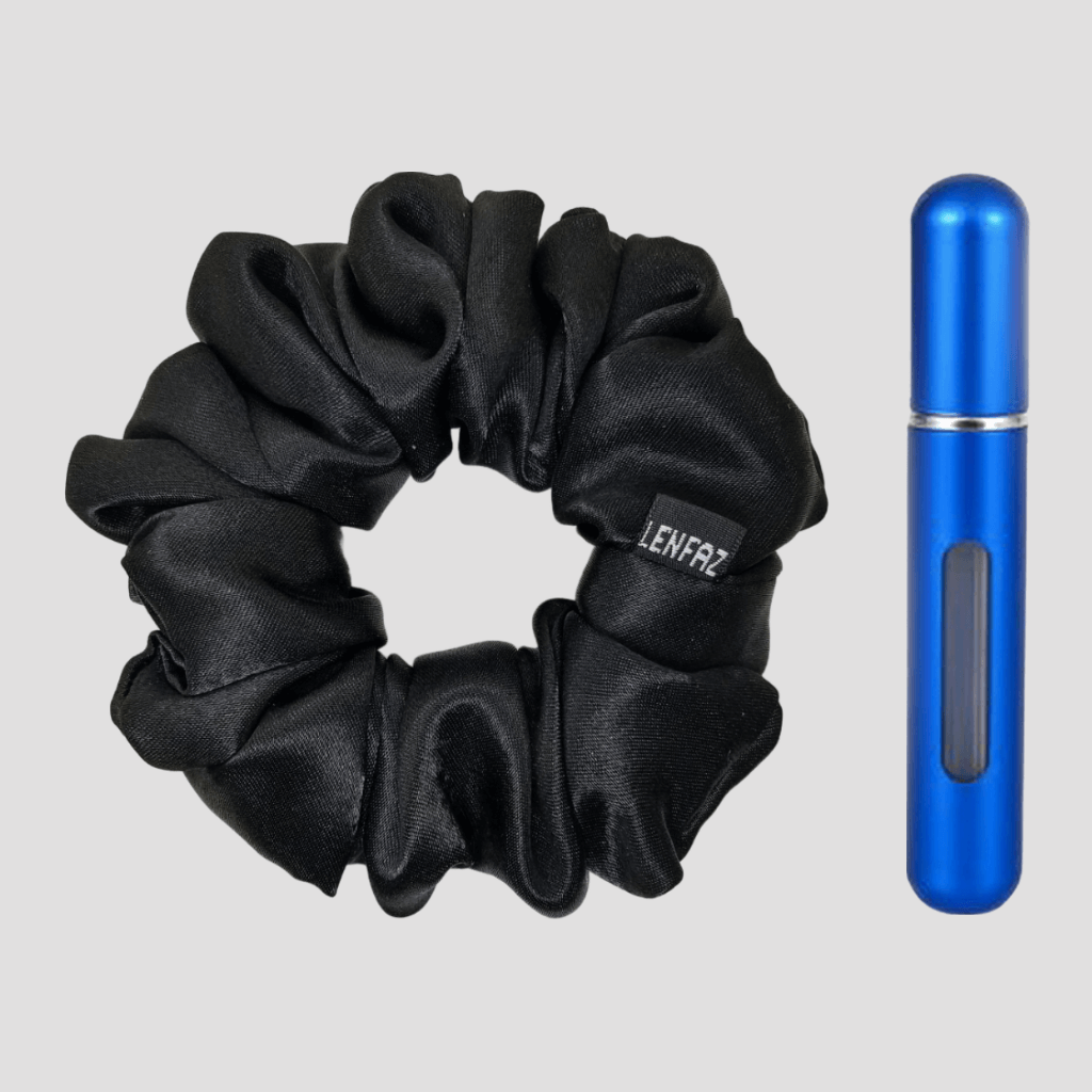 Radiant Black Satin Silk Scrunchie - Royal Blue Mini Perfume Spray Btl.
